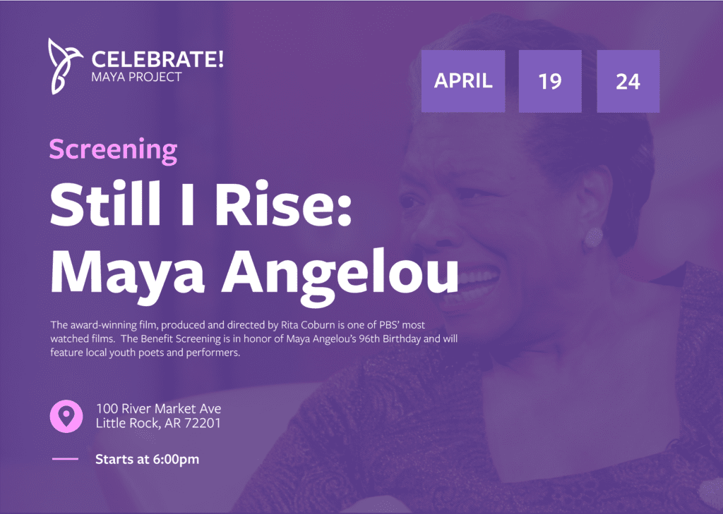 CelebratingMaya@96 is thrilled to announce a special screening event of the award-winning documentary “Still I Rise: Maya Angelou,” produced by Rita Coburn. The event will take place on Friday, April 19, 2024, at the prestigious Ron Robinson Theatre, commencing at 6 p.m.